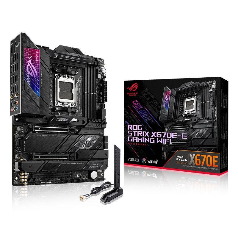 ASUS ROG STRIX X670E-E Gaming WiFi AM5 ATX Motherboard – Socket: AMD AM5 – Chipset: X670E – Memory: 4x DDR5 Slots (Up to 128GB, Max 6400MHz OC) – Expansion Slots: 2x PCIe 5.0 x16, 1x PCIe 4.0 x16 – Storage: 4x SATA3, 4x M.2 (3x PCIe Gen5, 1x PCIe Gen4) – Network: Wi-Fi 6E 2×2 + BT 5.2, 2.5G RJ45 – Rear I/O: USB-C 3.2 Gen2x2, 2x USB-C 3.2 Gen2, 10x USB-A 3.2 Gen2, DisplayPort 1.4, HDMI 2.1, Audio Jacks, Optical S/PDIF out, Wi-Fi Module – Form Factor: ATX – ROG STRIX X670E-E GAMING WIFI